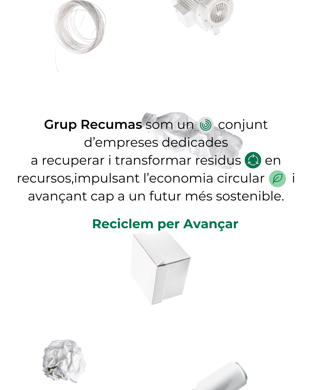El Grup Recumas som un grup d’empreses amb una trajectòria consolidada en la gestió de residus industrials i la valorització de materials. Amb anys d’experiència, estem compromesos amb la creació d’un futur més sostenible mitjançant solucions innovadores i adaptades a les necessitats dels nostres clients.
